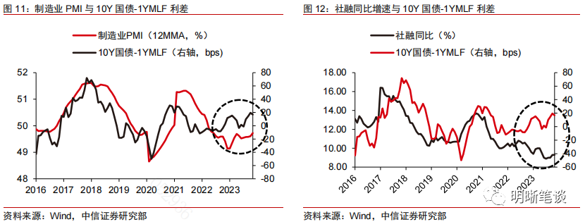 市场利率的波动是机构资金交易的结果,而其行为映射的深层逻辑通常是对宏观基本面的预期,国债利率与MLF的利差与PMI数据及社融增速高度相关。历史上,国债利率超出MLF运行的阶段并不少,但归根结底反映的是市场对经济基本面存在相对一致的预期。