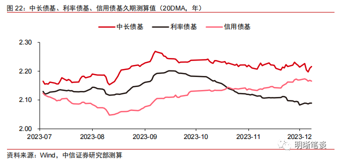 截至12月8日,我们测算得到的中长债基、利率债基、信用债基久期中位数的20日移动均值分别为2.216年、2.089年和2.165年。