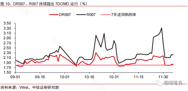 与存单利率的持续高攀不同,资金利率在结束11月跨月后反而出现逐步回归政策利率稳态运行的迹象,其背后或与央行持续保持较高的OMO投放强度以及财政资金的逐步回流有关。