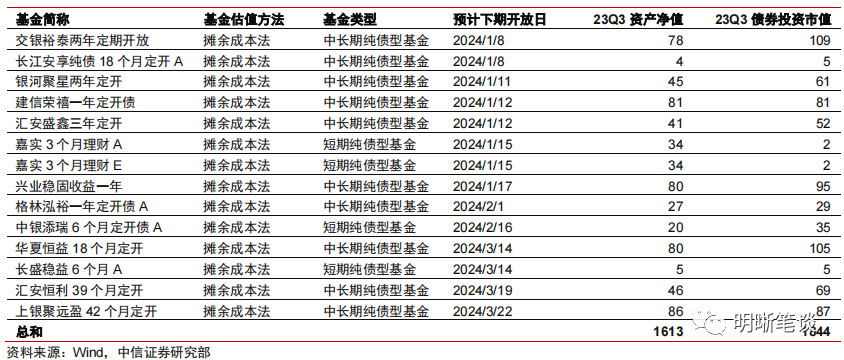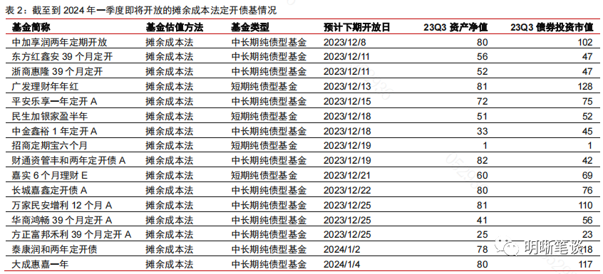 对于公募债基:核心增量仍在于机构委外,资本新规正式稿实施后,近期各基金公司也在积极筹备符合银行资本充足率管理需求、穿透便利度高的利率债指数类产品。此外在货基风险权重上升后,同样可应用摊余成本法平滑利润波动的摊余成本定开债基可能成为银行自营中长期委外配置的平替选择,自今年12月到明年一季度共有30只该类产品将再度打开(不包含C类),参考80亿元的募集上限和杠杆空间,我们粗略估计能为债市带来3000亿元以上的稳定配置资金。