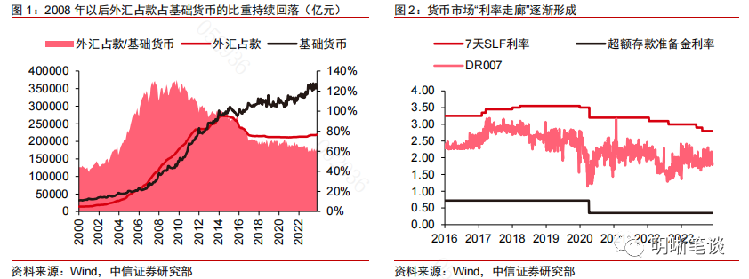2015年“8-11汇改”后,央行货币政策自主性得到明显提升,货币政策工具的价格信号对市场的预期管理作用不断增强。我国在加入WTO后直到2008年才由强制结售汇制度转为限额结售汇制度,长期处于国际贸易顺差地位导致央行被动式地通过购买外汇进而增加基础货币投放。2015年“8-11”汇改落地后,人民币兑美元汇率全面转为市场化,汇率调控的思路由锚定美元转为盯住一篮子货币。
