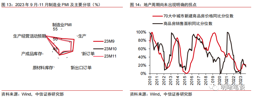 因此,即便10月和11月制造业PMI再度回落至荣枯线以下,但对债市利率的影响却极为有限。而在投资逻辑持续前向迭代的影响下,市场投资者更看重寻找新的预期差,此时一系列地产金融政策、财政加杠杆等着眼未来的政策和表态纷至沓来,即便尚未见到实际成效,但也会对市场情绪造成扰动。