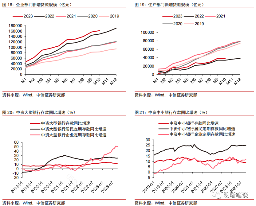而对于企业主要从国股大行处获得的低成本信贷资金,受限于社会整体景气度修复偏慢,部分资金并未投入实际生产运营,转而通过存款、资管产品再度回流银行体系,存款固化与套利空转的问题便由此发生。2023年以来,中资大型银行的企业定期存款增速大幅攀升且远高于整体增速,而揽储能力更弱的中小银行则主要依靠高息产品吸引居民存款进行负债扩张。