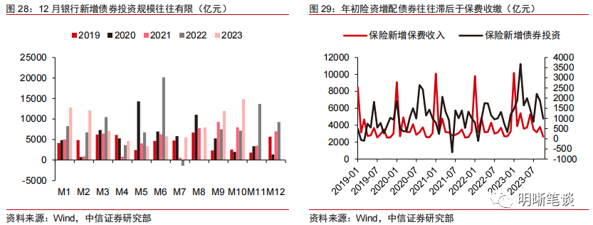 保险年初开门红通常能为险资负债端提供可观的增量资金,但受行业预收保费新规的影响,险资实际启动债券增配的时点或将相对滞后。整体来看,年末债市主要机构的配置力量或维持偏弱格局,短期内对债市利率下行难有较强的支撑作用。