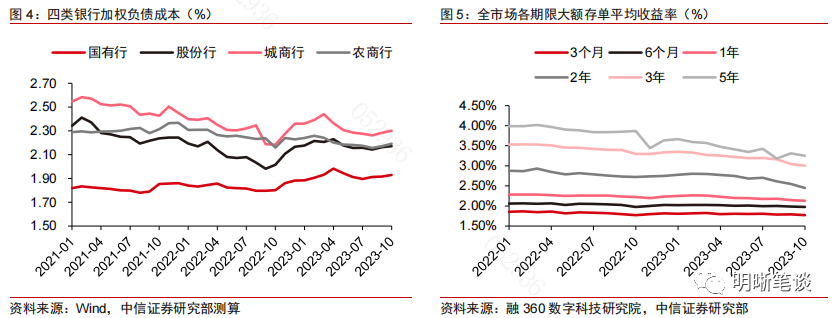 在此背景下,2022年4月,央行指导利率自律机制建立了存款利率市场化调整机制,自律机制成员银行参考以10年期国债为代表的债券市场收益率和1年期LPR为代表的贷款市场利率,合理调整存款利率水平。机制实施以来,以国股大行为代表,银行各期限存款及存单利率已实施两次集中调降,对应我们测算得到银行体系加权负债成本整体趋势下行。