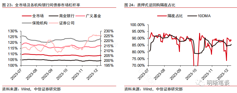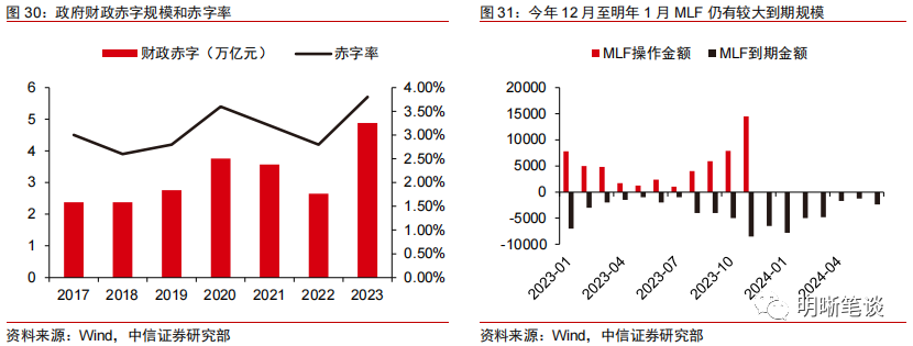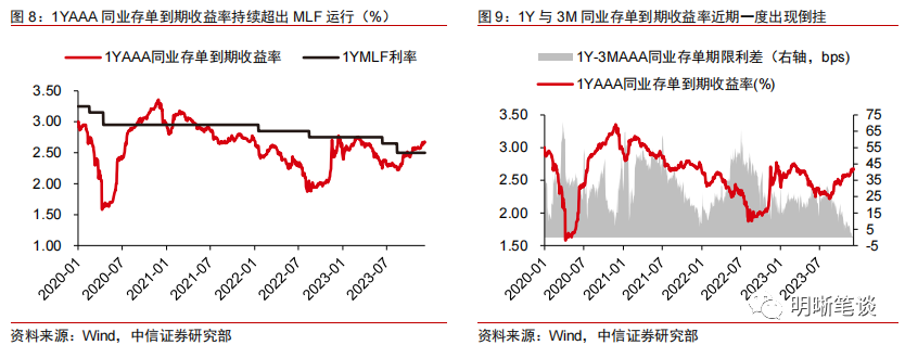 在实际操作中,MLF利率构成大行存单利率的理论上界,对于国股行等一级交易商,若存单融资成本超过MLF利率,则可通过提高对MLF的月度申报量来满足负债端的资金缺口。我们曾在2023年11月20日的外发报告《债市聚焦系列—同业存单与MLF的倒挂会持续多久?》中判断,短期内存单利率难有较大下行的空间。