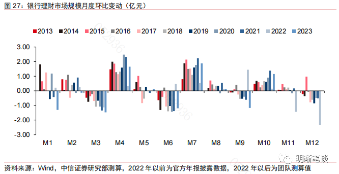 首先,年末受到银行考核影响,理财资金往往有驰援表内的客观需求,叠加大量产品多设置为季末、年末到期,届时银行理财的市场规模或出现季节性萎缩,根据我们测算,2018-2021年12月银行理财市场规模平均减少6100亿元。