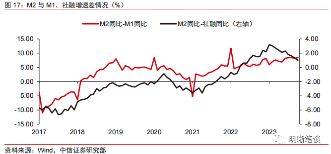 从宏观特征上看,各类经济指标似乎确实反映了“资金空转”的特征,自今年6月以来M2与M1的同比增速差始终维持在8%以上,截至到10月末收于8.40%。如果通过M2与社融同比反映实体经济与银行体系的货币供需均衡,两者增速差2023年虽有小幅回落但仍维持在正区间运行,截至10月末收于1%,而若剔除社融中的近期高增的政府债部分,则实体经济真正的内生性需求与广义货币增速的偏差将更大。