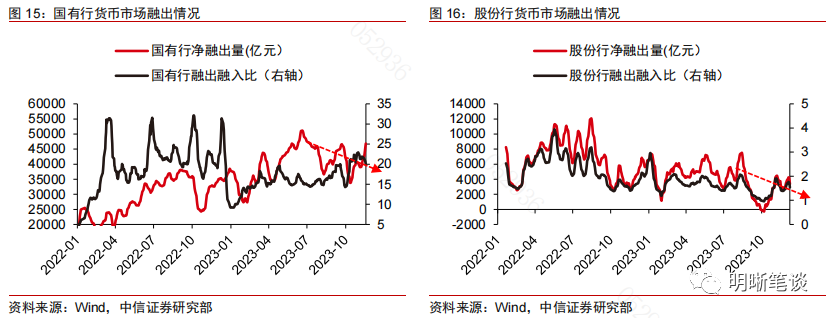 从微观层面的银行净融出情况上看,自7月末以来国股行货币市场回购净融出规模大幅回落,其中股份行在9月末甚至一度转为净融入,对比2022年的高中枢则差距更大。