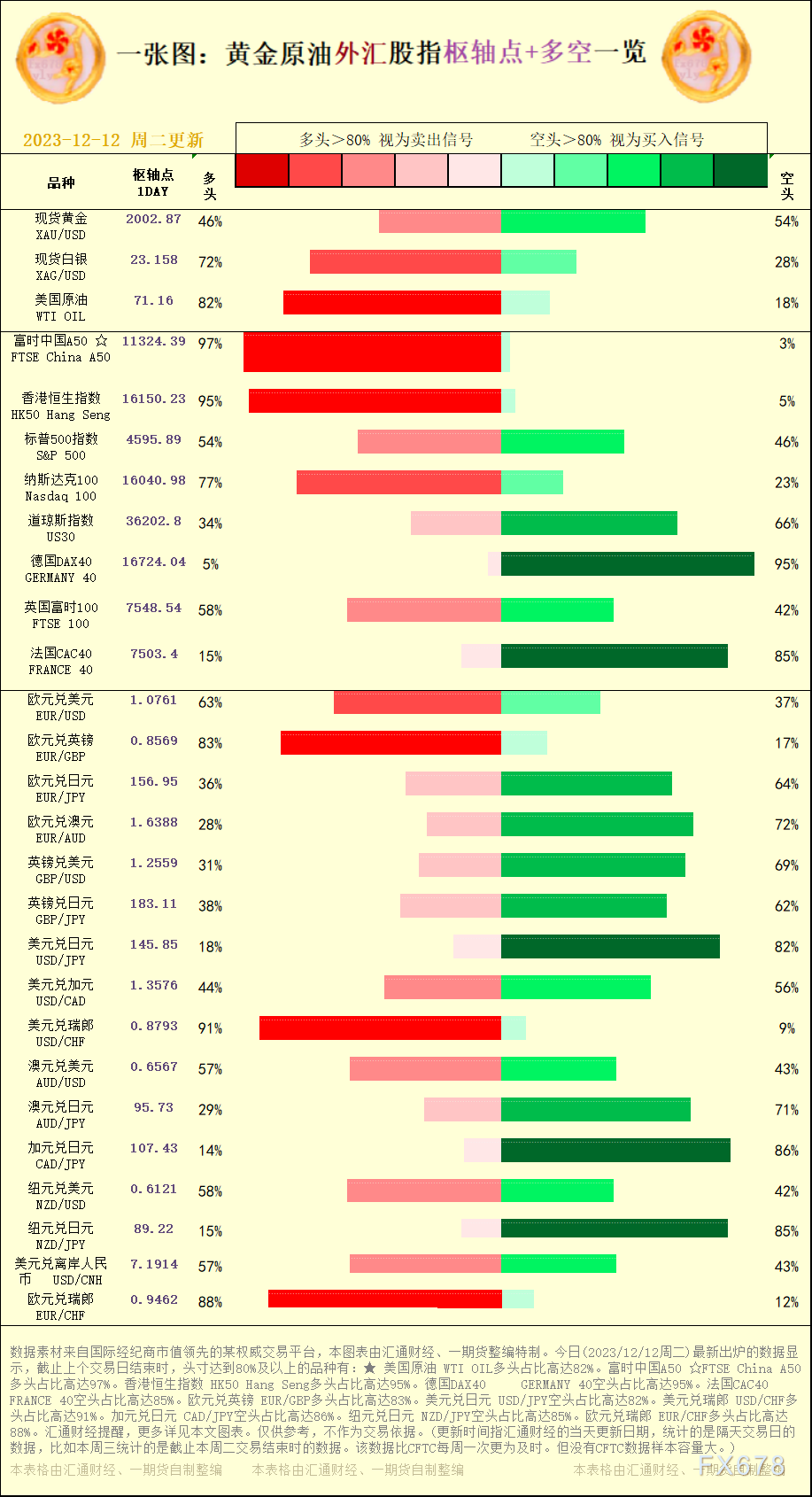 一张图:黄金原油外汇股指“枢纽点+多空占比”一览。今日(2023/12/12周二)最新出炉的数据显示,截止上个交易日结束时,头寸达到80%及以上的品种有:★ 美国原油 WTI OIL多头占比高达82%。富时中国A50 ☆FTSE China A50多头占比高达97%。香港恒生指数 HK50 Hang Seng多头占比高达95%。德国DAX40GERMANY 40空头占比高达95%。法国CAC40FRANCE 40空头占比高达85%。欧元兑英镑 EUR/GBP多头占比高达83%。美元兑日元 USD/JPY空头占比高达82%。美元兑瑞郎 USD/CHF多头占比高达91%。加元兑日元 CAD/JPY空头占比高达86%。纽元兑日元 NZD/JPY空头占比高达85%。欧元兑瑞郎 EUR/CHF多头占比高达88%。汇通财经提醒,更多详见本文图表。仅供参考,不作为交易依据。