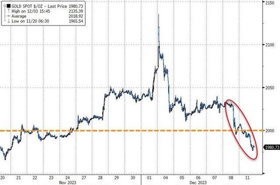 最终,COMEX 2月黄金期货收跌1.03%,报1993.7美元/盎司,刷新11月22日报以来收盘低位,自11月22日感恩节前以来首次收盘跌穿2000美元关口,连跌三日。