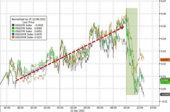对利率前景更敏感的2年期美债收益率在亚市早盘下破4.73%,美股盘前曾升破4.77%,刷新上周五所创的11月28日以来高位,十年期美债标售公布后,持续回吐升幅转降,到债市尾盘时约为4.71%,日内降约1个基点,在上周五反弹后回落。