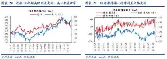 近期10年期美欧利差走阔、美日利差收窄。12月7日,10年期美欧国债利差为190bps,一周前为174bps。12月8日,10年期美日国债利差为344bps,一周前为350bps。