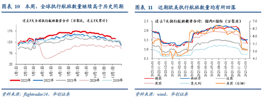 近期欧美执行航班数量均有所下滑。美国方面,截至12月10日的一周内,执行航班数量累计为5.03万架次,12月3日当周为5.14万架次。欧洲方面,12月10日当周,主要国家执行航班数量累计为5.94万架次,12月3日当周为6.03万架次。