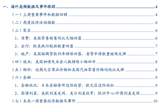 (二)美国经济数据:①景气向上的包括:美国WEI指数回升;抵押贷款利率下行,房贷申请指数回升;汽油零售价格反弹。②景气向下的包括:零售销售同比大幅回落;航班执行数量下降;初请失业金人数持续小幅回升。