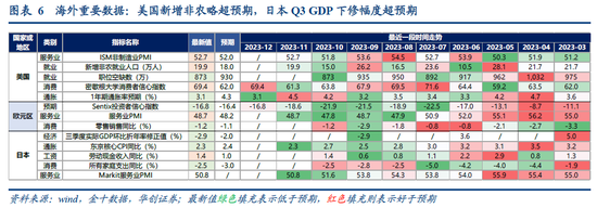 (2)欧元区:①服务业PMI超预期。11月,欧元区服务业PMI录得48.7,高于彭博一致预期48.2,环比10月提升了0.9个点。②零售销售不及预期,显示商品消费仍疲软。10月,欧元区零售销售同比-1.2%,低于彭博一致预期-1.1%,较9月边际改善,提升1.7个百分点。