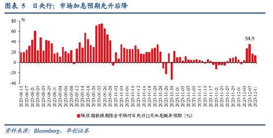 首先,近期日银行长和副行长的讲话导致市场加大了对年底负利率结束的押注。①12月6日,日本央行副行长冰见野良三在出席活动时表示:“如果操作得当,退出宽松货币政策将为经济带来好处,因为广大家庭和企业,将从工资和物价上升中受惠,但他没有预先设定退出的时间表或顺序。”②12月7日,日本央行行长植田和男表示:“从年底开始,政策制定将变得更具挑战性。我们将努力进行适当的沟通,并实施适当的政策。”上述言论使得市场对日央行可能提早加息(即12月加息)提高了警惕,隔夜指数掉期隐含的12月加息概率预期由3.5%左右飙升至34.9%。