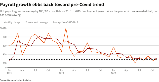 上周公布的数据显示,11月失业率从3.9%降至3.7%,三个月平均新增就业岗位仍超过20万个,高于疫情前10年的18.3万个。