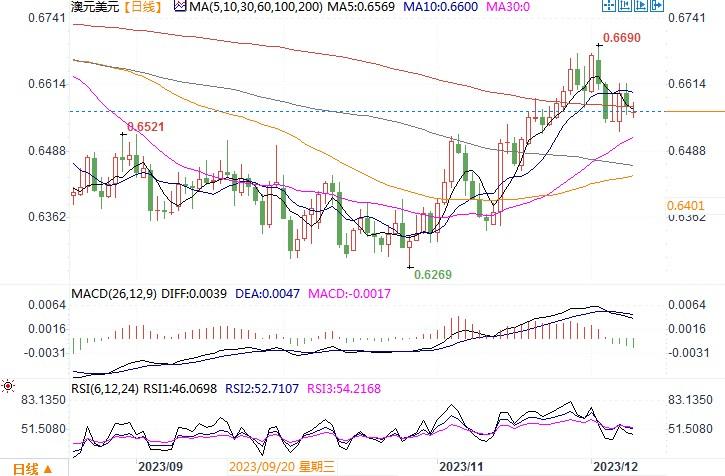 上周五(12月8日),澳元兑美元下跌0.32%,收盘在0.6579。美元受强劲非农数据抬捧上升,造成澳元后撤。上周澳元/美元下跌1.1%,部分原因是澳洲央行周二维持利率不变。而且会议声明中提到充分就业目标意味着澳洲央行不太可能大幅改变货币政策。为此,市场普遍认为澳洲央行的政策紧缩已经结束,2月加息的可能性仅为10%。预计澳洲央行的下一步行动将是降息,可能在明年8月进行,明年的总体宽松幅度为27个基点。澳元利率前景预期的改变,短期继续施压澳元。日线图上,澳元/美元紧贴在布林带通道中轨线0.6565水平附近,技术指标开始呈下摆趋向。一旦跌穿上述布林带通道中轨线,澳元短期下行将变得明显。只有收盘价企稳于0.6620之上,跌势方有望扭转。