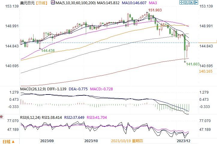上周五(12月8),美国公布强劲的非农数据后,美元指数上涨0.3%,美元兑日元上涨0.52%,收盘于144.93。美国劳工统计局表示,11月非农就业岗位增加19.9万个,接受路透访查的经济学家此前预计将增加18万个。就业报告显示失业率降至3.7%,表明金融市场对美联储最快可能在2024年第一季度开始降息的预期为时尚早。为此美元在周五受支持上行。尽管日元在美国11月就业数据公布后下跌,但稍早上涨1.2%,周四急升2%,此前日本央行总裁植田和男给出了央行正在考虑何时结束负利率政策的最明确指引刺激日元大幅走升。日本央行高层在货币政策上的态度转鹰,一定时期内将成为日元转向的最大推动力。但是如果日本央行迟迟不能将结束负利率付诸于行动,日元上涨空间将会受限。本周初美国强于预期的非农数据仍会有余波影响,顺势继续对美元构成一定的支撑,美元兑日元大幅下跌后的空头回补交易料也会延续。上方阻力依次在146.20、147.30;下方支撑依次在144.00、143.20。