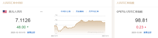 12月13日,人民币中间价报7.1126,上调48点,上一交易日中间价报7.1174。