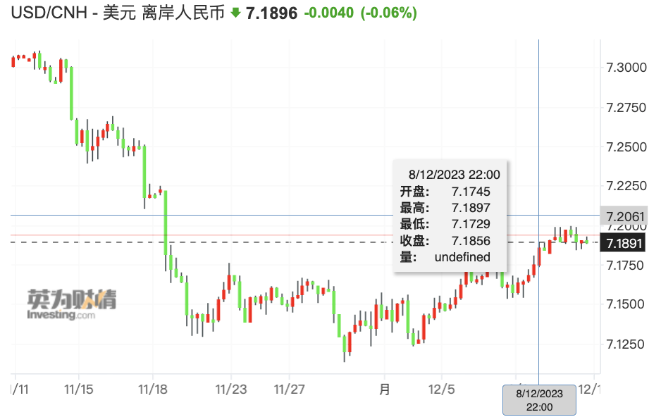 在一系列重磅事件之前,人民币也陷入区间波动。此前,人民币对美元一度最强升值至7.12附近,升值幅度逼近2000点。截至北京时间12月12日17:50,美元/离岸人民币报7.1904,美元/在岸人民币报7.17。