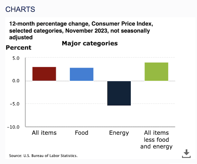 当地时间12日,美国劳工部发布最新数据,11月消费者物价指数(CPI)同比上涨3.1%,符合预期,较前值3.2%下滑0.1个百分点,该指标曾于去年6月飙升至40年来的最高水平9%;环比来看,11月CPI环比上涨0.1%,10月则是环比持平。