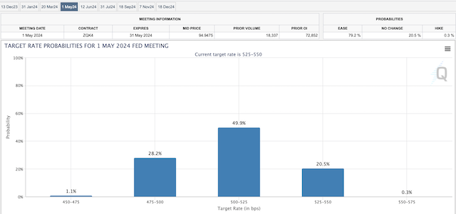 同日,美联储召开一连两天的议息会议,这是该央行年内的最后一次会议,绝大多数交易员预期货币政策将维持不变。据芝商所利率观察工具(FedWatch Tool)的数据,明日宣布按兵不动的概率为98.4%,加息25个基点至5.50%~5.75%的概率仅为1.6%,2024年5月降息的概率则高达79.2%。
