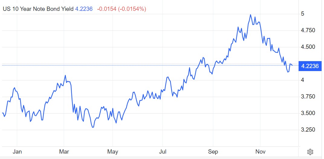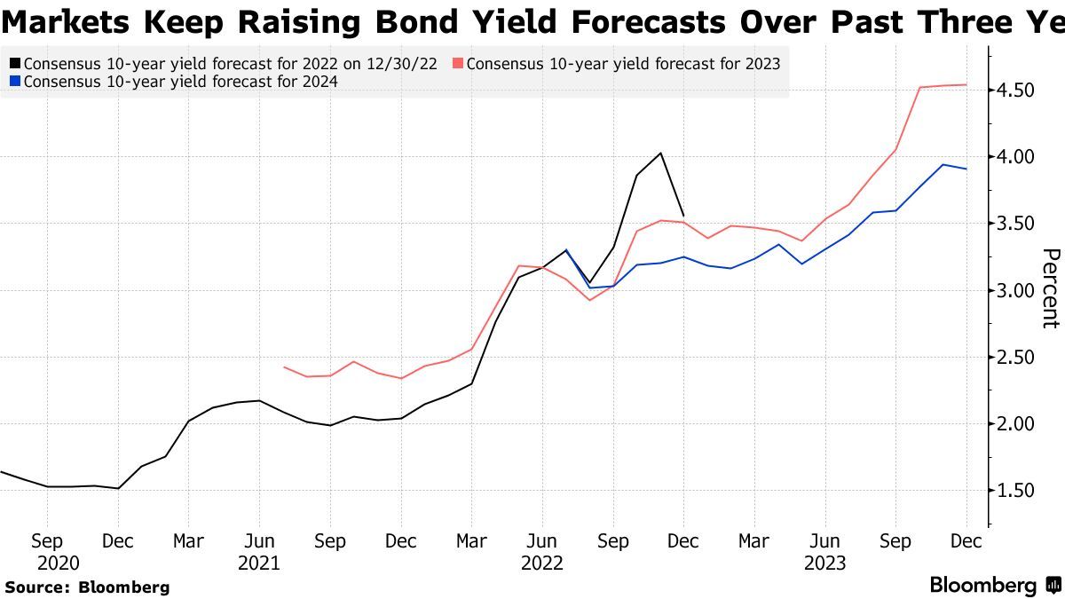 但11月迅猛的涨势凸显出这样一种风险,即市场过早地忽视了美联储在通胀得到安全控制之前长期维持高利率的可能性。彭博社调查的经济学家和策略师的平均预测显示,到2024年底,10年期美国国债收益率将下滑至3.9%,这一数值明显低于上述三位精准预测今年收益率涨势的策略师。