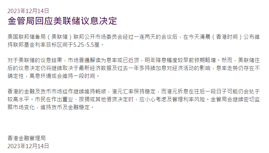 上证报中国证券网讯 据香港金融管理局12月14日消息,香港金管局发文表示,对于美联储的议息结果,市场普遍解读为息率或已近顶,明年降息幅度较早前预期略增。然而,美联储往后的议息决定仍将继续取决于最新经济数据及过去一年多持续加息对经济活动的影响,息率走势仍存在不确定性,高息环境或会维持一段时间。香港的金融及货币市场运作继续维持畅顺,港元汇率保持稳定,而港元拆息在往后一段日子可能仍会处于较高水平。金管局会继续密切监察市场变化,维持货币及金融稳定。