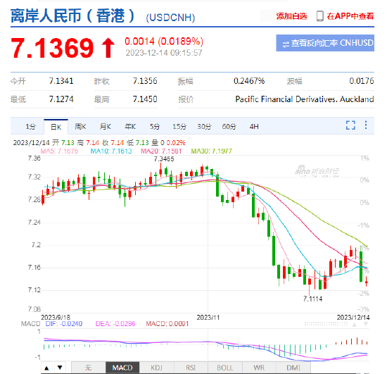 12月14日,人民币中间价报7.1090,上调36点,上一交易日中间价报7.1126。离岸人民币兑美元一度升破7.13关口。