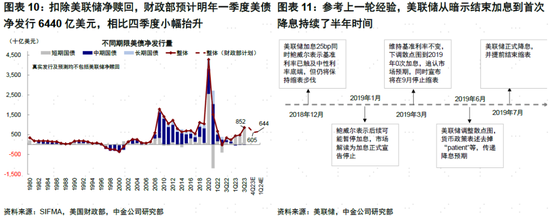 虽然我们认为基本面并不支持美联储在一季度就开启降息,但若假设美联储出于非基本面因素选择提前降息,可能的考虑来自三个方面:1)预防式降息,可以预防式降息一两次观察效果,类似于停止加息观察紧缩效果。美联储提早小幅降息有助于防范过度紧缩的风险,如1995年和2019年,经济均未衰退但美联储都分别小幅降息75bp,且距下次降息分别停止了一年和4个月。但站在当前角度,由于融资成本刚刚压制,预防式降息可能冒着较大需求再度上行的风险。2)对冲缩表的流动性收紧影响。虽然当前美联储缩表仍在按计划进行,但是TGA账户已基本回补至合理水平、且隔夜逆回购还可在很大程度对冲财政部净发债(美联储账上逆回购已快速回落至当前的1.18万亿美元左右,6-10月合计对冲短债净发行幅度达81%)。我们测算金融流动性明年一季度仍有支撑,但二季度之后则将开始显现,除非届时美联储选择停止缩表并降息。3)避开干扰大选之嫌。美国2024年将于明年7月和8月共和民主两党初选结束,候选人正式提名后进入最终阶段,货币政策届时的变化也将难免对此有一定影响。