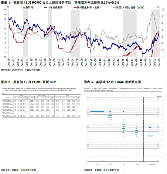 北京时间今天凌晨,12月FOMC落下帷幕。与预期一致(会前CME期货隐含12月不加息概率98%),美联储继续停止加息,维持基准利率在5.25%~5.5%,这已是7月加息25bp后连续第三次暂停加息,也被市场视为事实上的加息停止。
