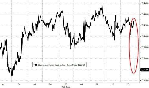 美联储周三公布12月利率决议,连续第三次按兵不动,公布的点阵图显示,本轮加息周期已完成,官员们预计2024年将降息75基点,明年底的联邦基金利率为4.6%,大幅低于9月时预期的5.1%。美联储释放鸽派信号下,美股、美债、黄金拉升,美元跳水。