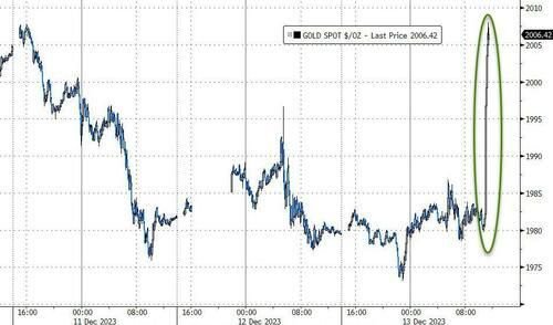 黄金价格涨约1.9%,最高触及2017美元。