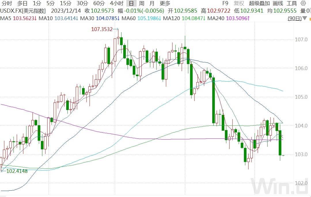 12月13日,美元指数跌0.83%报102.95,非美货币普遍上涨,欧元兑美元涨0.74%报1.0875,英镑兑美元涨0.41%报1.2616,澳元兑美元涨1.51%报0.6659,美元兑日元跌1.76%报142.89。