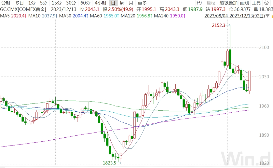 12月13日,国际贵金属期货大幅收涨,COMEX黄金期货涨2.5%报2043.1美元/盎司。