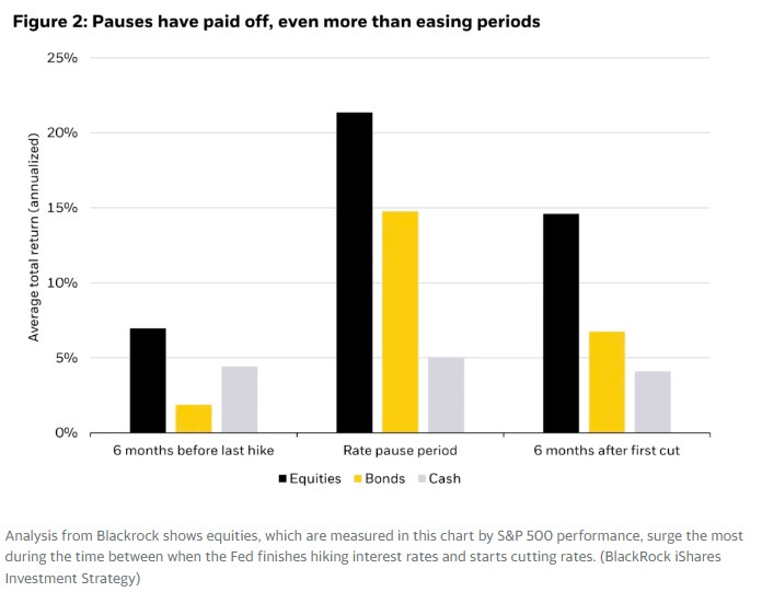 这种情况意味着美联储在加息和降息周期之间的“暂停期”已经开始。根据贝莱德美洲iShares投资策略主管Gargi Chaudhuri的研究,这个暂停期是投资者应该持有股票而非在货币市场基金中收集利息的时期。