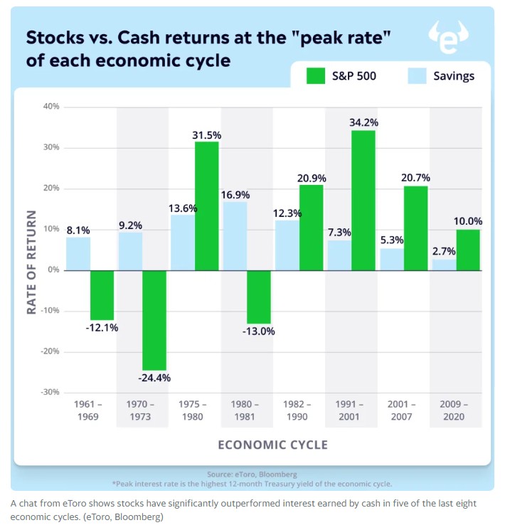 虽然风险较低,但从长期来看,现金错失了股市中的潜在机会。Cox提供给雅虎财经的研究显示,在过去8个经济周期中的5个中,股票显著跑赢了现金(每个周期以官方宣布的经济衰退结束,而自2020年以来尚未发生)。