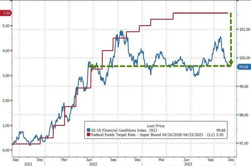 这一点其实也不难理解。随着数据偏弱、通胀回落,以及联储鸽派发言,目前金融条件已较11月FOMC会议时大幅放松。如下图所示,高盛编制的金融条件指标的宽紧程度目前已经回落到了去年6月时的水平。