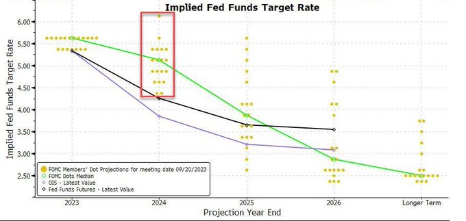 可以预见的是,美联储官员最新对明年底利率的预测,是多半会较9月点阵图出现下移的——因为当时的预测是基于今年还会再加息一次来判断,但这一幕如今已不会发生。以9月时的情况看,美联储当时认为明年将降息至5.1%——等同于判断2024年会降息两次。但如果当前还维持这一预测,那么就只相当于明年仅降息一次——这似乎可能性不大。