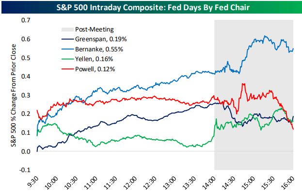 值得一提的是,根据研究机构Bespoke的统计,在近四位美联储主席(格林斯潘、伯南克、耶伦和鲍威尔)的任内,美股在鲍威尔任内的议息日里,表现是相对最弱的。尤其是在美股尾盘阶段,往往会受到利率决议的影响而遭遇打击。而今晚,鲍威尔是否还会在新闻发布会上扮演市场的“杀手”,不妨让我们拭目以待。