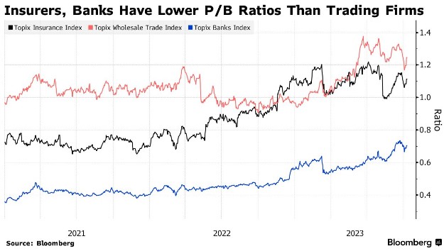 香港Sparx Asia Investment Advisors Ltd.旗下管理2.94亿美元轩尼诗日本基金的Masakazu Takeda表示,保险公司的市净率较低,基本面强劲,回报率相对较高。瑞穗证券和三菱UFJ摩根士丹利证券的分析师表示,主要银行也看好货币政策收紧的可能性。