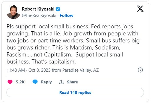 清崎认为,关于就业增长的报告是一个谎言,实际上指的是从事两份工作或兼职的人,这伤害了小企业,而大企业却变得更富有,他称这种情况为“马克思主义、社会主义、法西斯主义”,而不是资本主义,其核心应该是支持当地小企业。