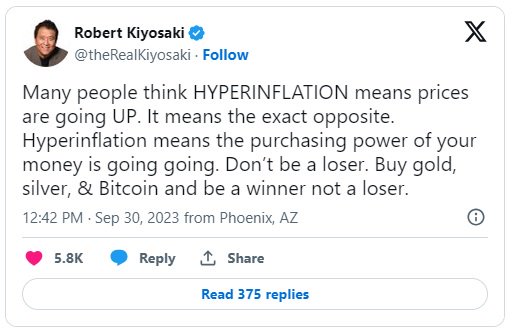 事实上,这位金融教育家最近指出,恶性通胀并不是许多人认为的那样——价格上升。在他看来,这实际上是“相反的意思”,指的是货币购买力的下降。