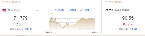 10月11日,人民币中间价报7.1779,上调2点,上一交易日中间价报7.1781。
