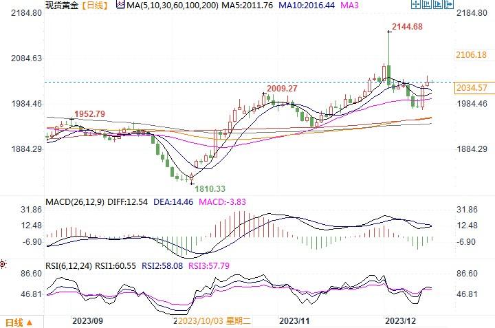 现货黄金日线图北京时间12月15日11:59 现货黄金 报 2035.57 美元/盎司