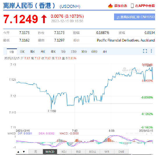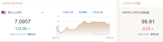 12月15日,人民币中间价报7.0957,上调133点,升值至2023年6月5日以来最高,上一交易日中间价报7.1090。