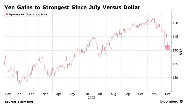 由于交易员加大对美联储2024年更大幅度降息的押注,同时对日本央行退出负利率的猜测挥之不去,日元兑美元周四上涨超1%。