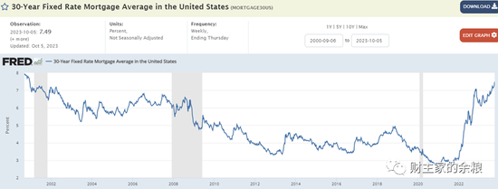 比方说,美国30年期固定利率抵押贷款的利率已经飙升到了7.5%,经历了过去15年极低利率的美国人,恐怕没有多少买房人愿意在如此高的利率之下选择买房(2002-2007年远低于此的利率就已经引发次贷危机,然后导致2008年全球金融危机爆发)。